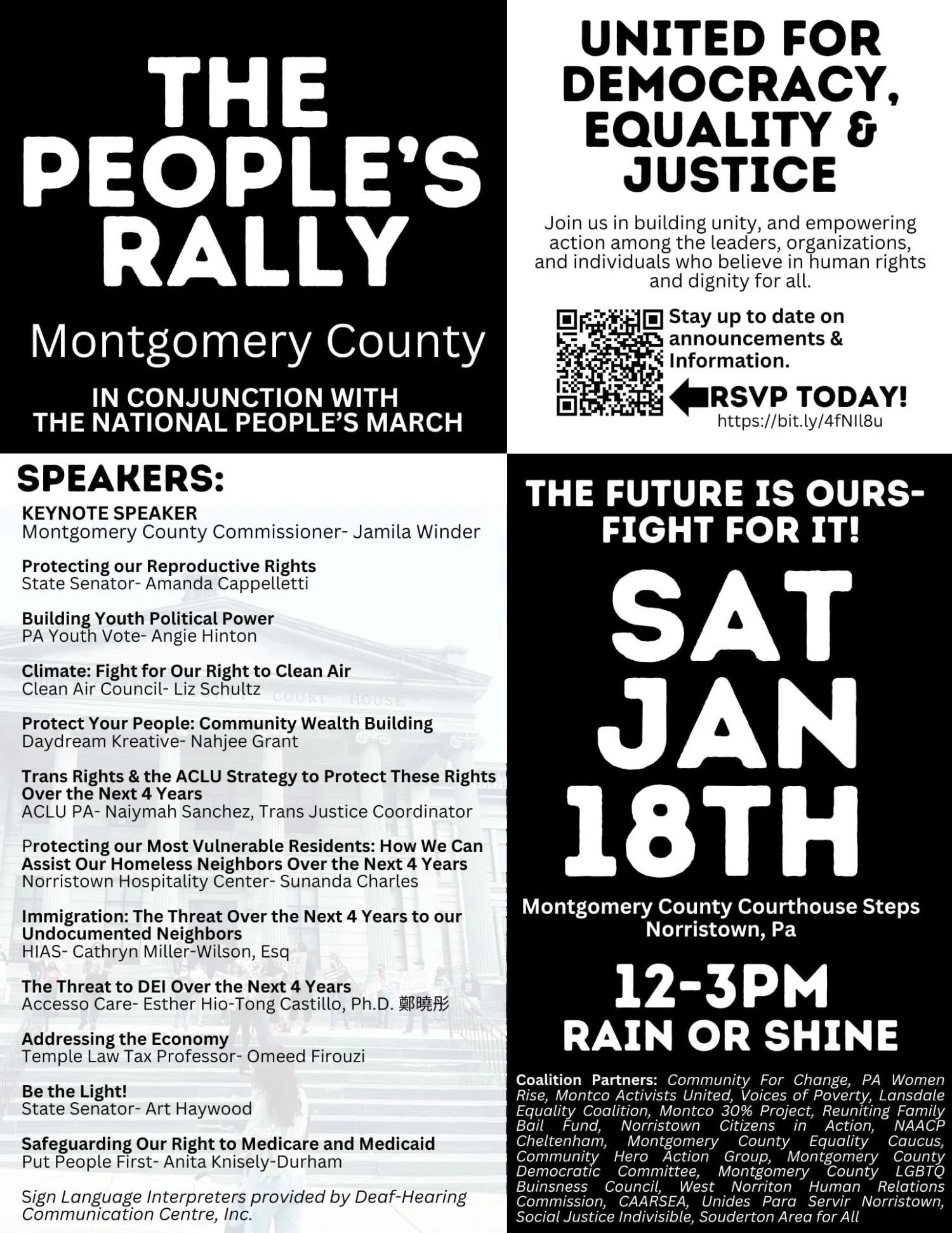 This rally is in conjunction with the National People’s March (formerly Women’s March), which will take place in D.C. and around the country. Our rally will feature speakers from various organizations and government offices who will speak about vital issues like immigration, reproductive rights, the economy, DEI, climate, community building, and trans rights.